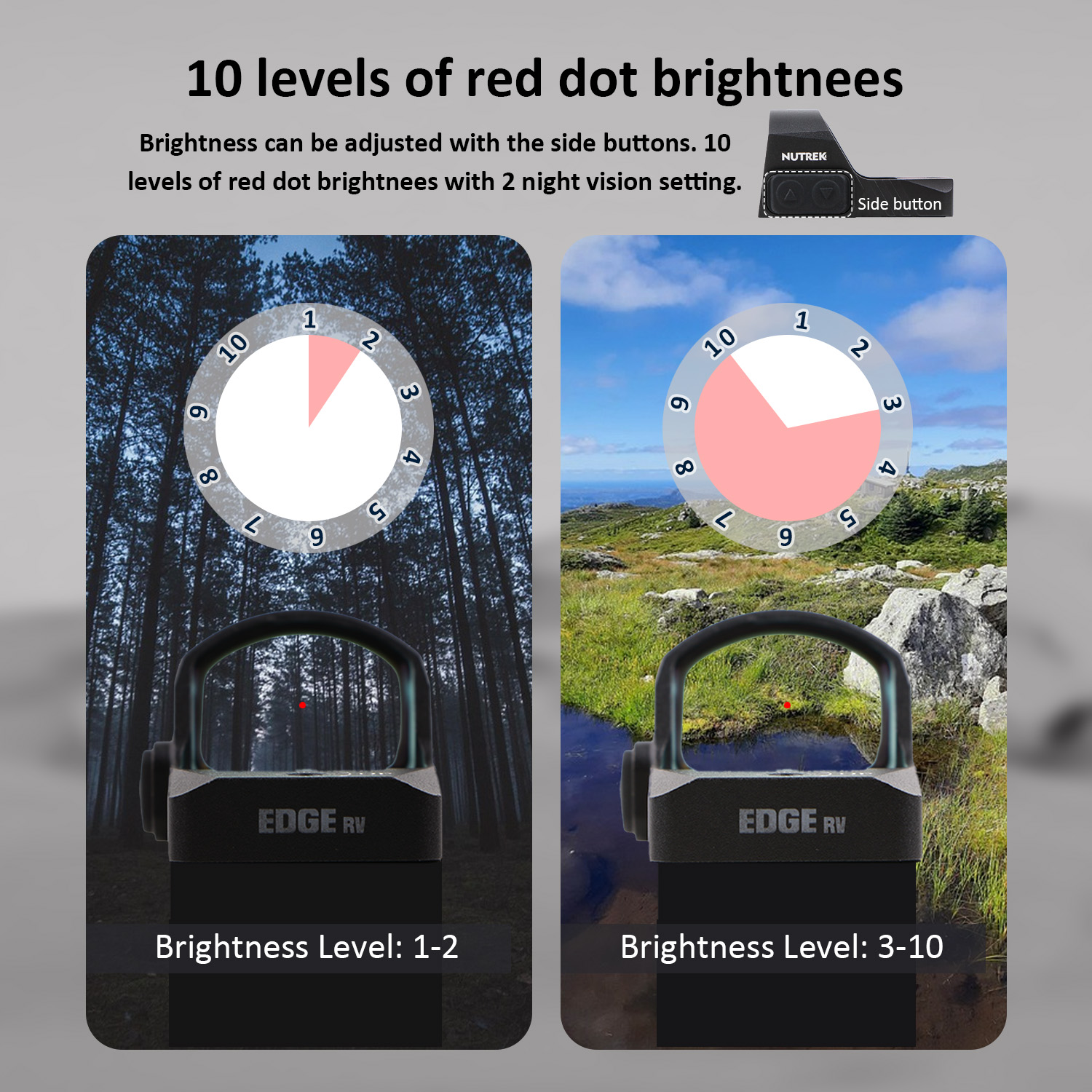 The EDGE reflex sight features a smart photosensitive sensor that automatically adjusts brightness to match ambient light conditions. For full control, it also offers 10 brightness levels via side buttons—including 2 night vision-compatible settings and 8 daylight settings—ensuring clear visibility in any environment.