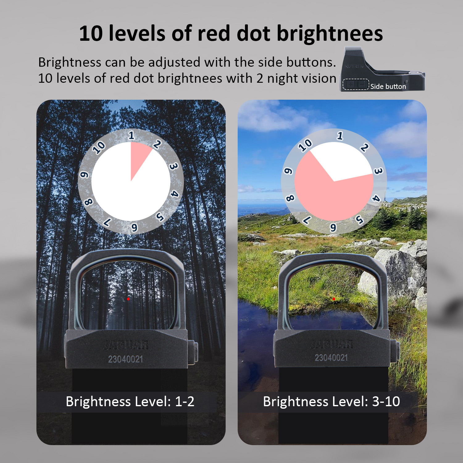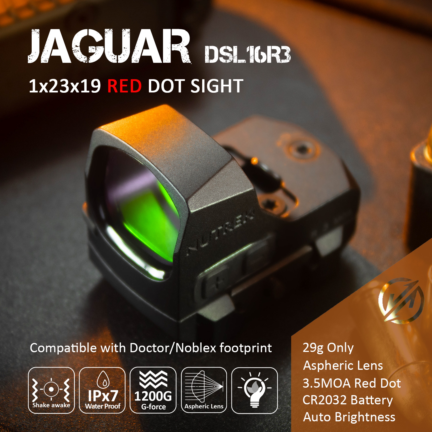 | JAGUAR | DSL16R3 | 3.5 MOA | Red Dot | 10 | For Doctor/Noblex | 1x23x19 | 1 MOA/Click | CR2032 | 20,000+ hrs | 26 |