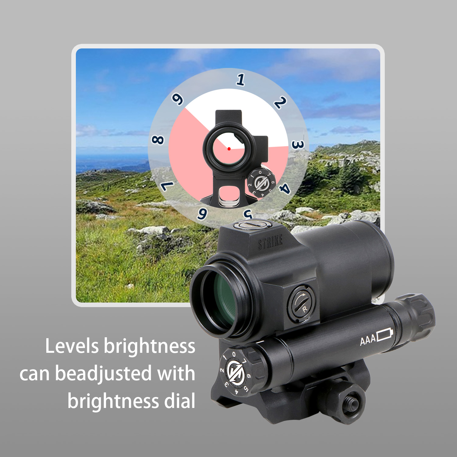 | STRIKE | DST26R | 2 MOA | Red Dot | 7 | Picatinny | 1x20 | 1 MOA/Click | AAA | 8,000+ hrs | 174 |