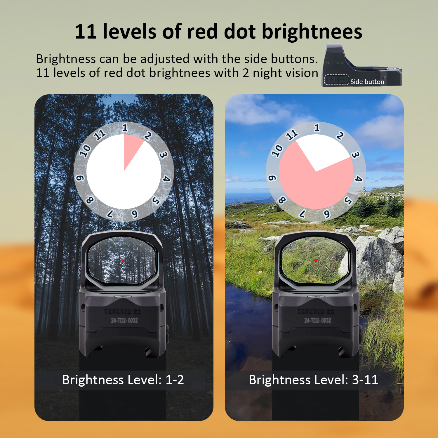Equipped with 11 brightness levels, including 2 night vision settings, the reticle remains crisp and visible in any lighting condition.
