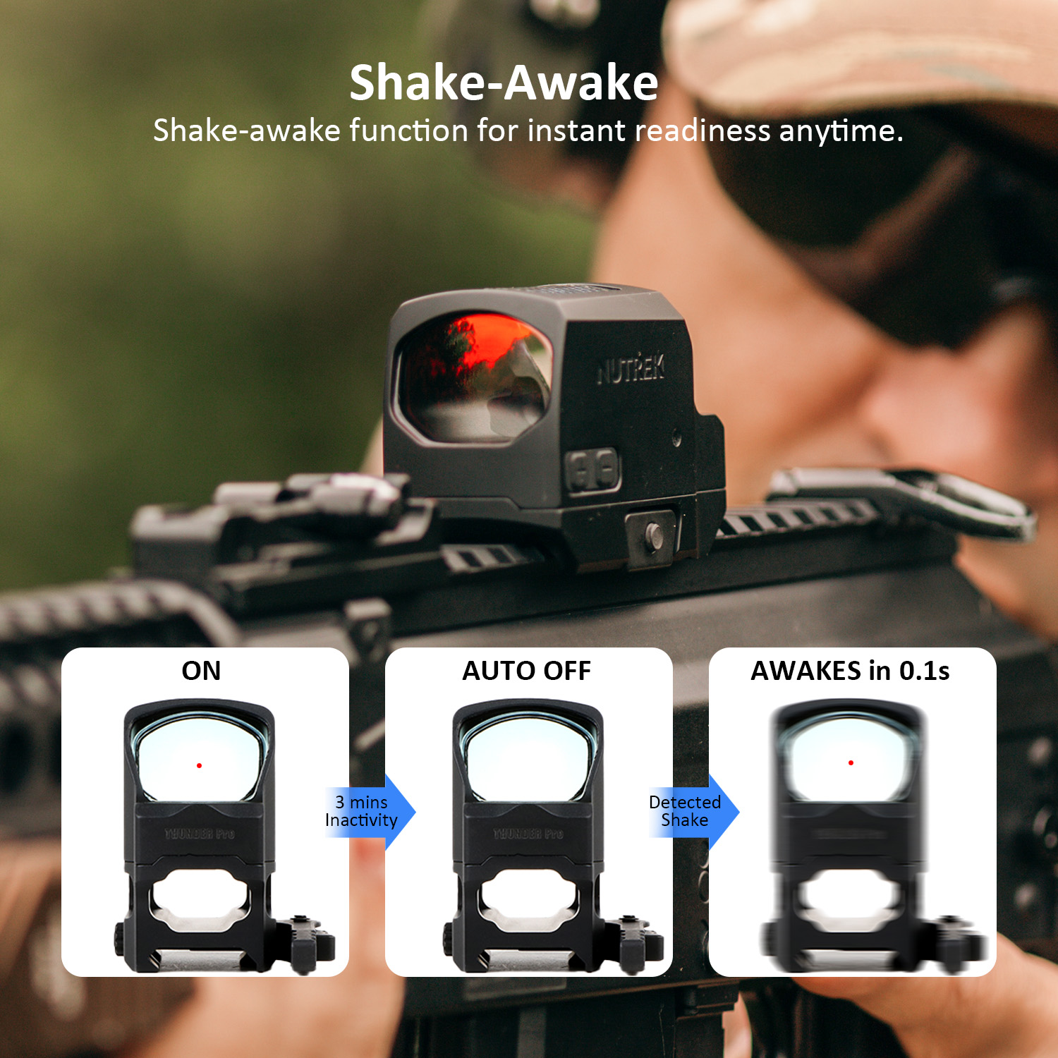 Built to withstand harsh conditions, the THUNDER PRO is IPx7 waterproof and has shock resistance of 1200G, making it suitable for heavy-recoil firearms.