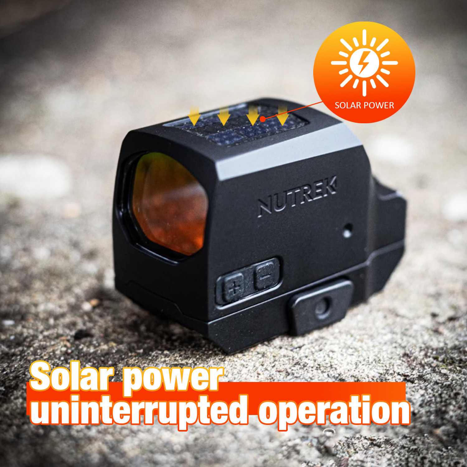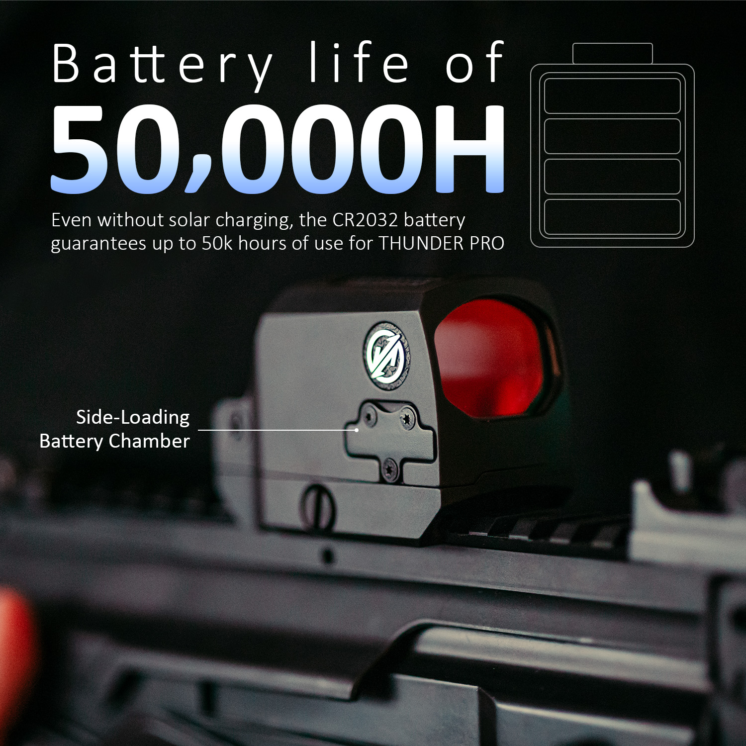 The THUNDER PRO runs on a CR2032 battery with up to 50,000 hours of runtime. Its solar panel powers the 11-brightness red dot using natural sunlight or bright indoor lighting.
