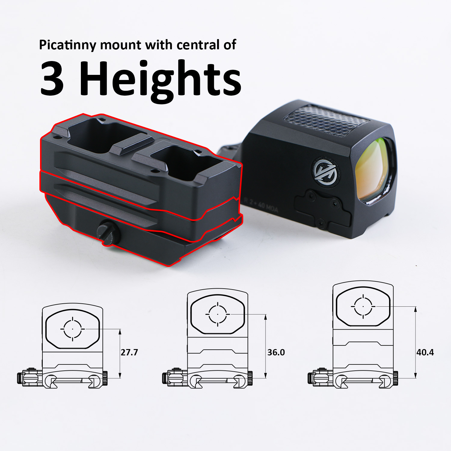 Picatinny rail mounts with central height options of 27.7mm, 36mm, or 40.4mm.