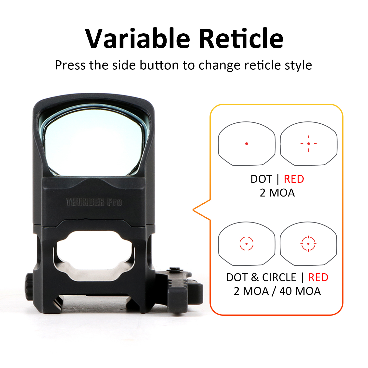 | THUNDER PRO | DST32RSV | 2 & 40 MOA | Red Dot & Circle | 11 | Picatinny | 1x30x22 | 1 MOA/Click | CR2032 | 50,000+ hrs | 131 |