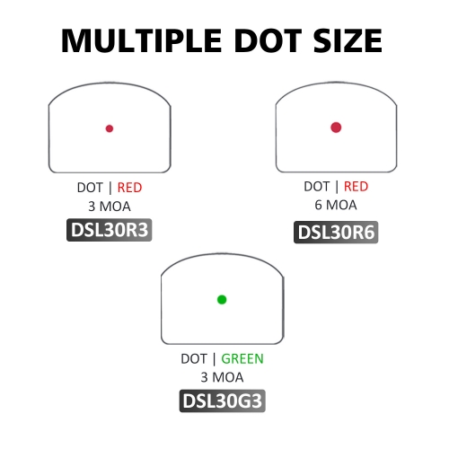 | DSL30R3 | for RMR footprint | 24x18mm | IPX7 | Dot | Red | 3MOA | 11 | Continual | 5000G | ≤ 2 MOA | 8,000+ hrs | 45.2x31x28.5 mm | 25 g | |