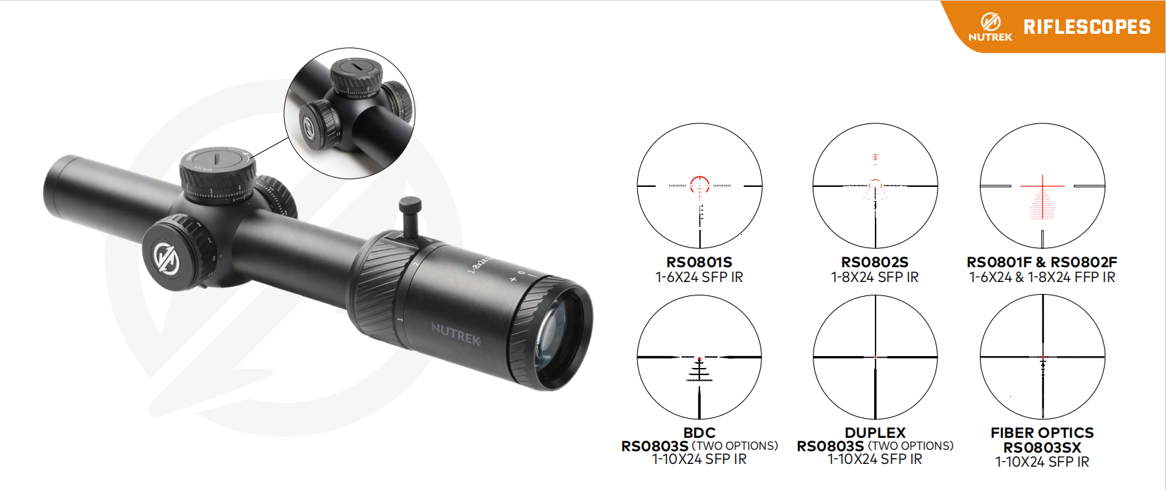 | MODEL | 1-6x24 | 1-8x24 | 1-10x24 | 1-6x24 IR FFP | 1-8x24 IR FFP | 1-10x24 FFP | ||