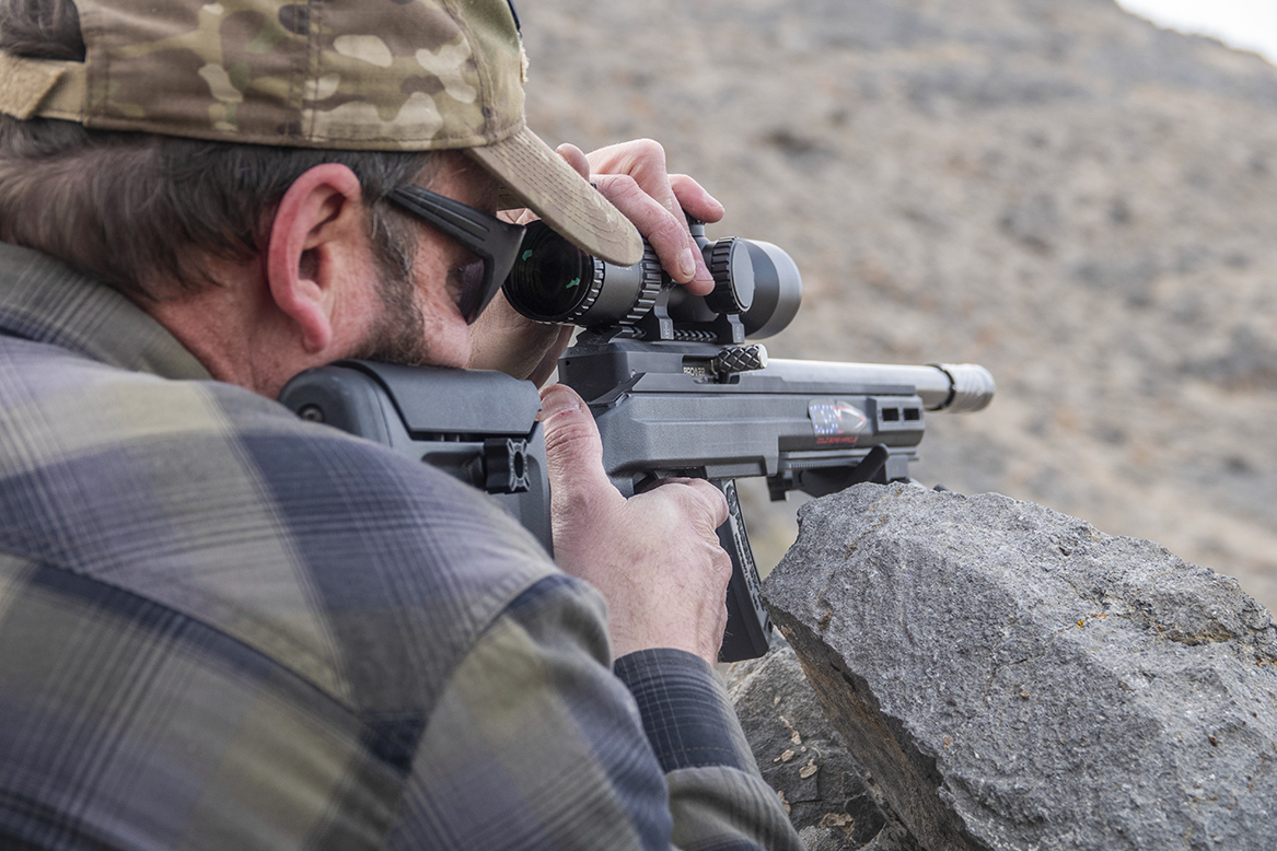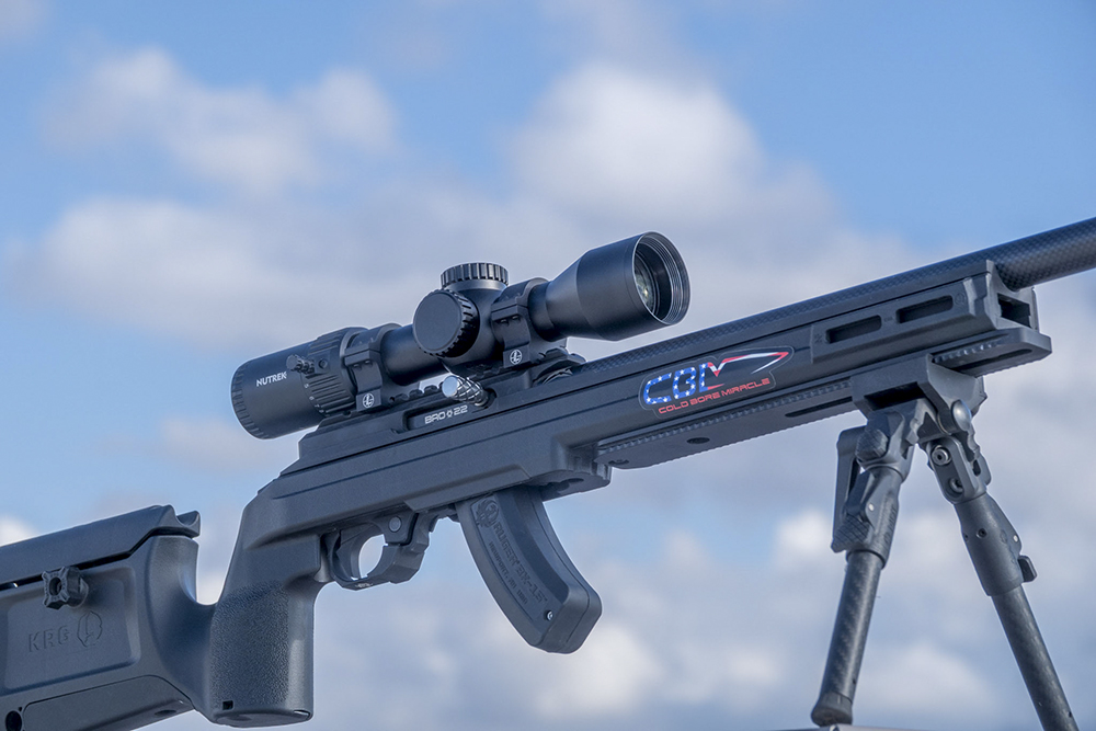 this scope fits nicely on Coldboremiracle’s custom .22, seen here in a KRG Bravo chassis and using an Anechoic suppressor.